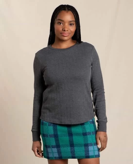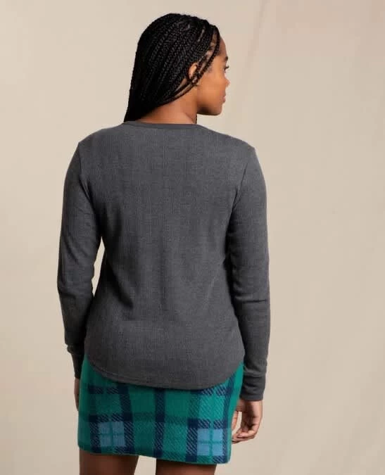 The Toad & Co Foothill Pointelle Long Sleeved Crew has a soft, lightweight organic cotton fabric blended with durable polyester and a scalloped trim along the neckline for a nice feminine detail.