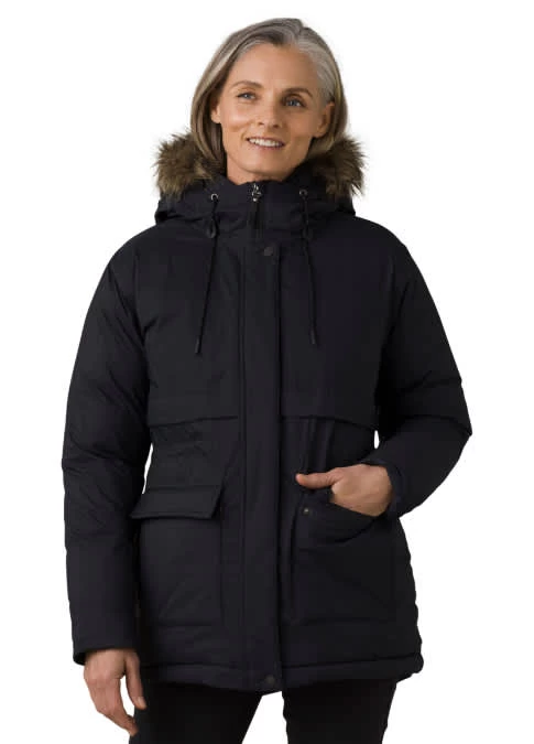 The prAna Banajaara Jacket for women has a bluesign®-approved shell and is made with Responsible Down Standard Certified filling. Design features include a PFC-free durable water repellent coating, critically taped seams, a high fill weight, dual-entry hand pockets lined with soft micro fleece, an interior security zip pocket, a waist drawcord system, front and side hood drawcord systems, removable faux fur, a micro-fleece lined collar and cuffs, and a standard fit.