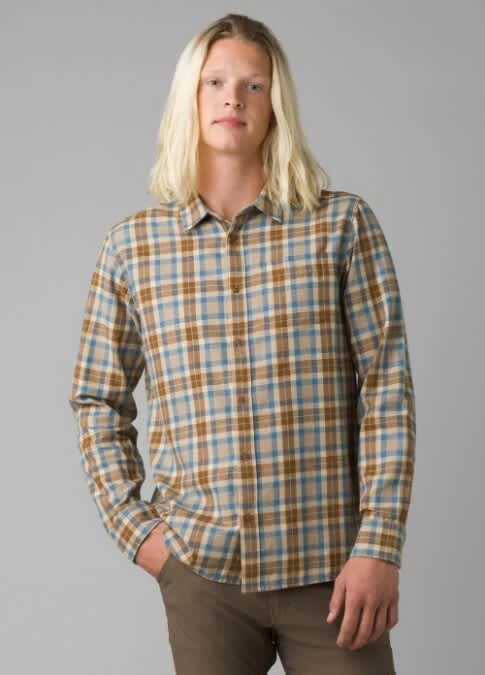 The prAna Los Feliz Flannel for men is made from a blend of organic cotton and recycled polyester. Design features for this lightweight style include a single left chest pocket, sideseam triangle patch details, an internal cord hanger loop, and a classic standard fit.