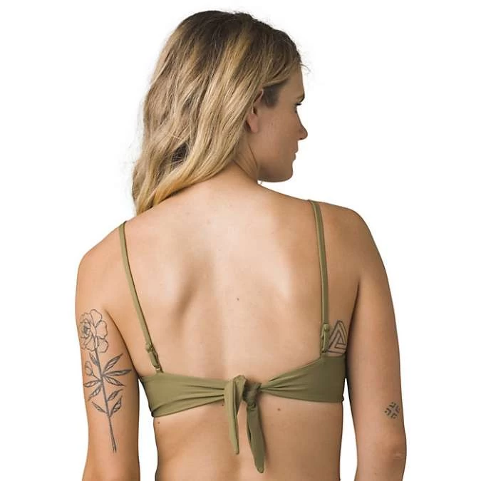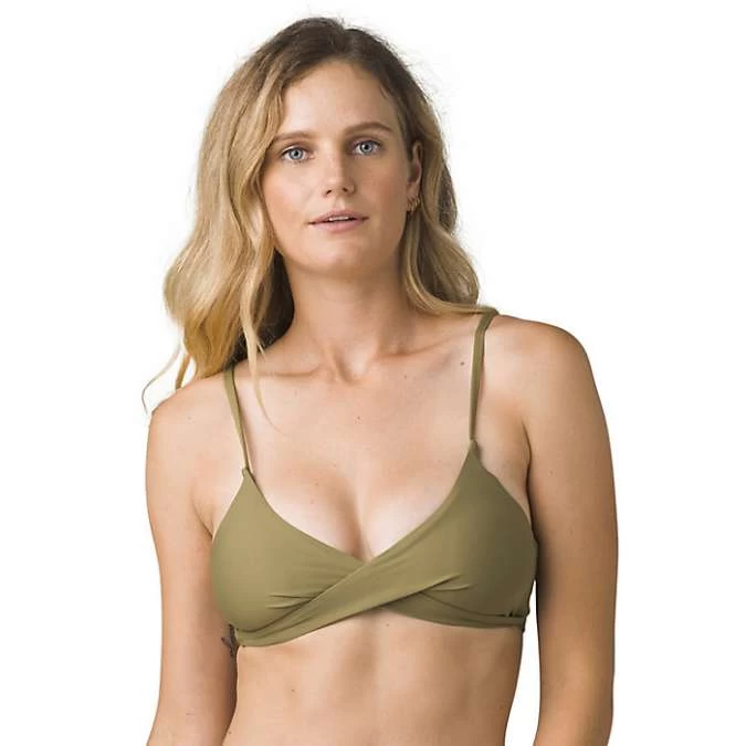 The prAna Ruby Sands Top for women is a swim style made with ECONYL® regenerated nylon and built by a Fair Trade Certified™ factory. Design features include a wrap front top, V neckline, adjustable shoulder straps and adjustable tie-back closure, full lining, removable soft cups, moderate bust support, and moderate coverage.